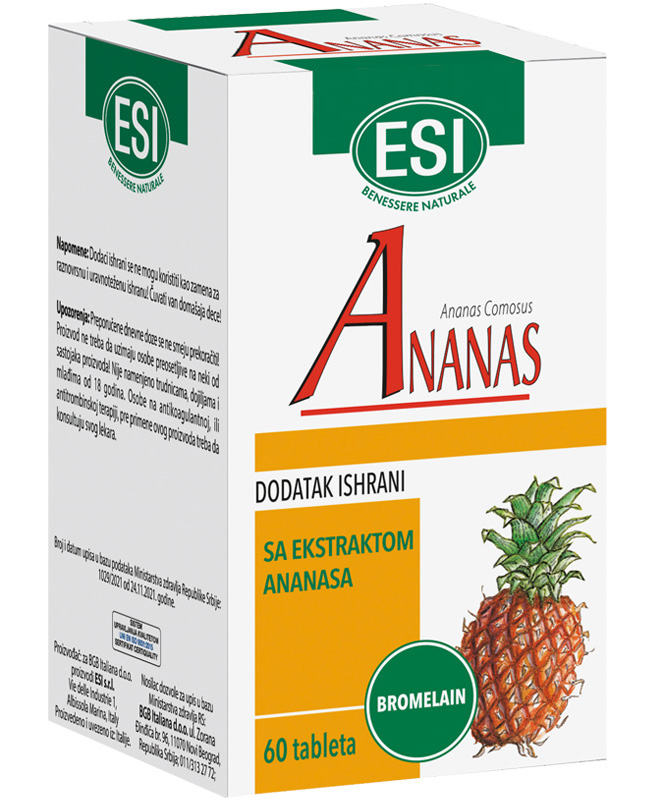 ESI ANANASDijetetski dodatak ishrani na bazi ananasa koji povoljno utiče na varenje i izbacivanje tečnosti iz organizma pa se tradicionalno koristi kao prirodna pomoć za mršavljenje i eliminaciju celulita. Visoka aktivnosti enzima bromelin obezbeđuje bolje varenje i razgradnju celulita i masnih naslaga. Zbog ovih izuzetnih osobina, preporučuje se i ženama koje u toku menstrualnog ciklusa imaju problem s varenjem (gasove i nadutost) i zadržavanjem tečnosti (oticanje nogu i/ili stomaka).